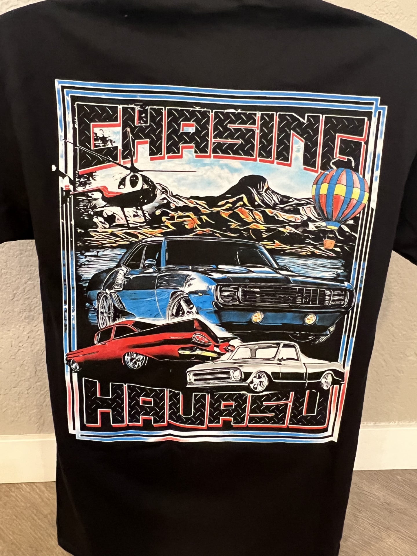 This eye catching graphic design features 8 different color screens that bring out the magic of what Chasing Havasu is about. This is our new CAR design.